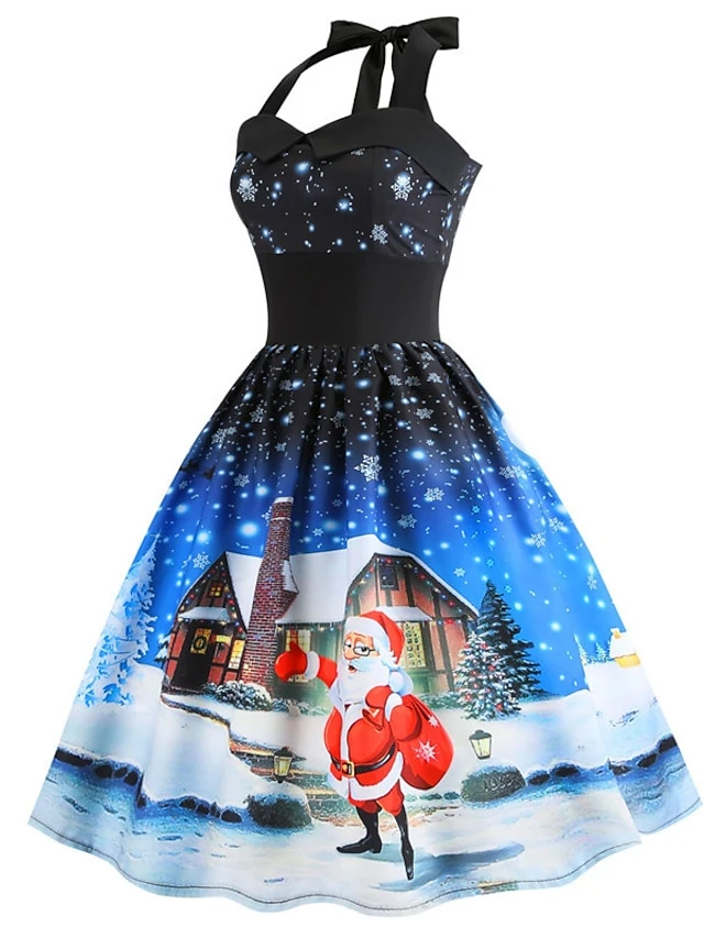 Women’s Christmas Swing Dress Vintage Dress Midi Dress Blue Purple Fuchsia Red Sleeveless Santa Claus Backless Print Winter Fall Halter Neck Vacation Stylish Elegant 2022 S M L XL XXL