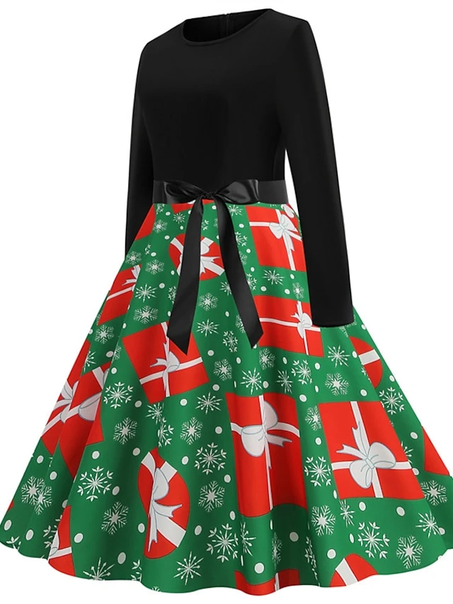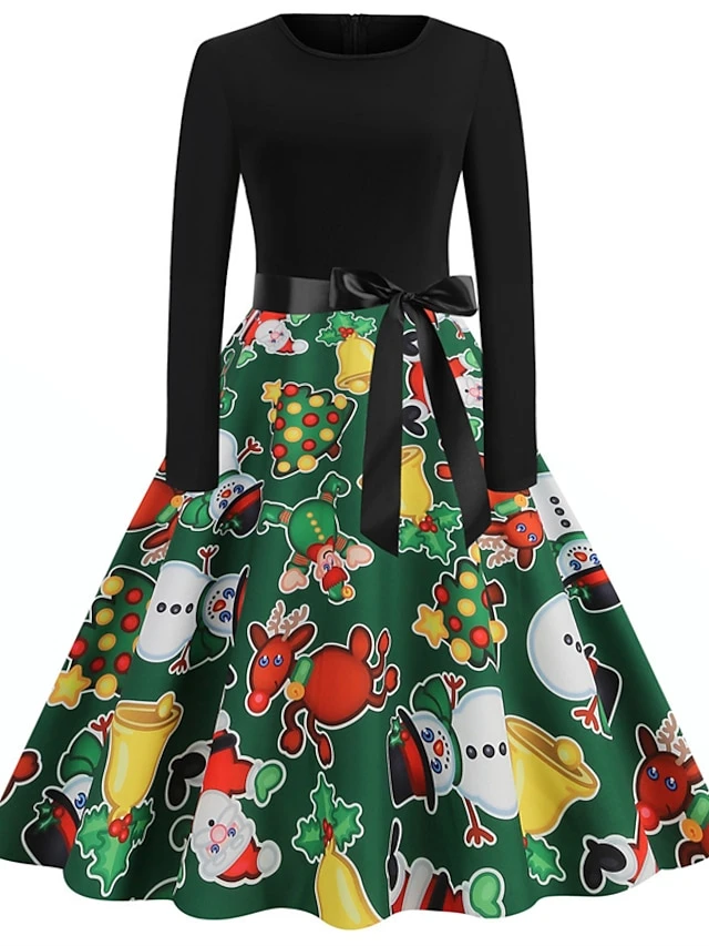 Women’s Christmas Swing Dress Vintage Dress Midi Dress Green Blue Light Green Long Sleeve Santa Claus Bow Winter Fall Autumn Crew Neck Fashion Daily Date 2022 S M L XL XXL 3XL