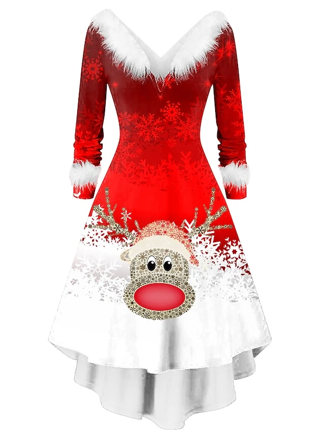 Women’s Christmas Swing Dress Vintage Dress Midi Dress Green Silver Wine Red Brown White Long Sleeve Print Plus High Low Print Winter Fall V Neck Vintage Romantic Traditional 2022 S M L XL 2XL