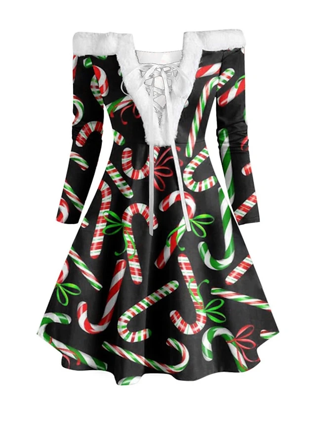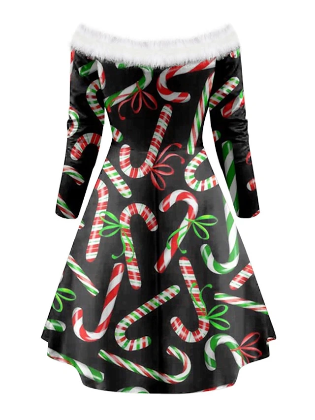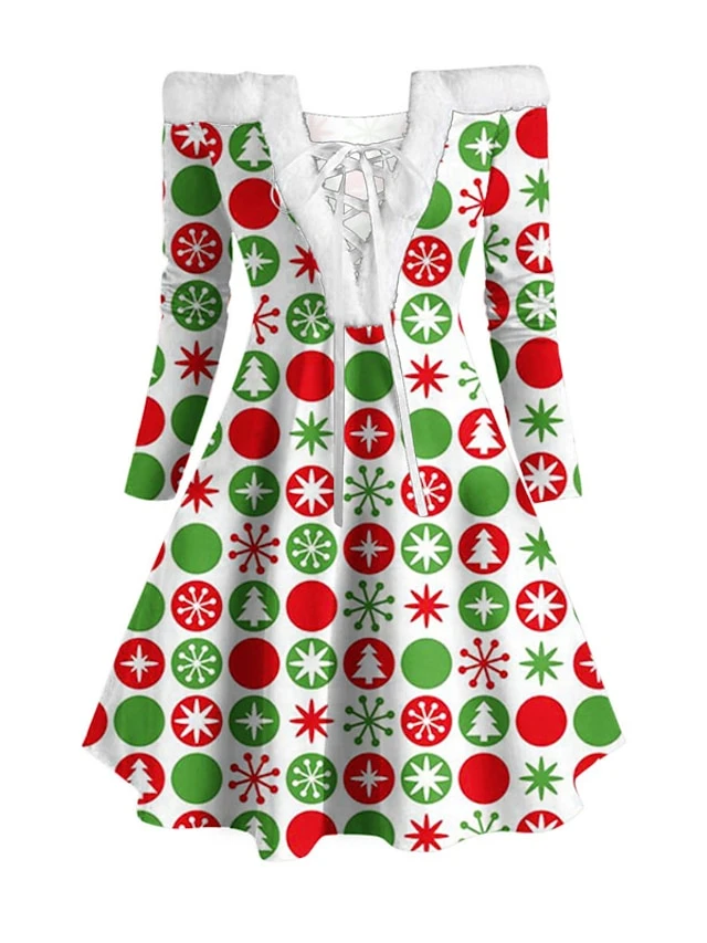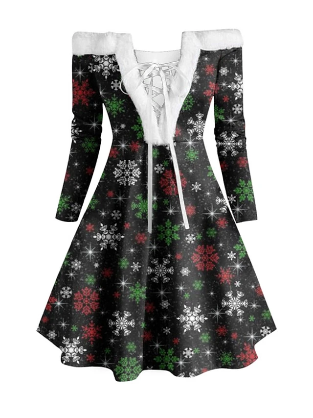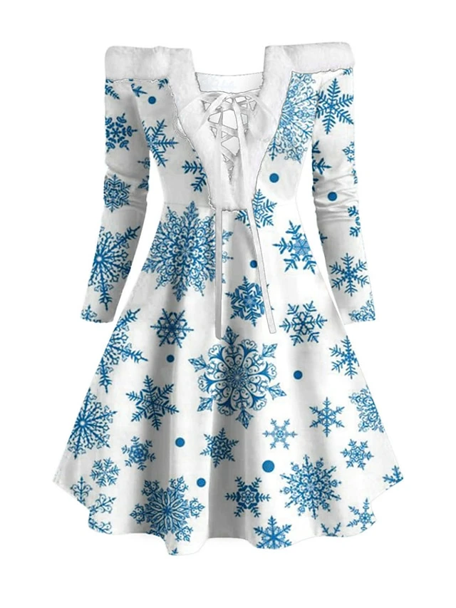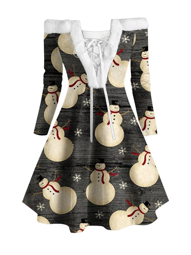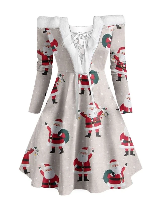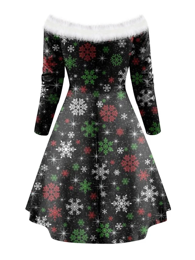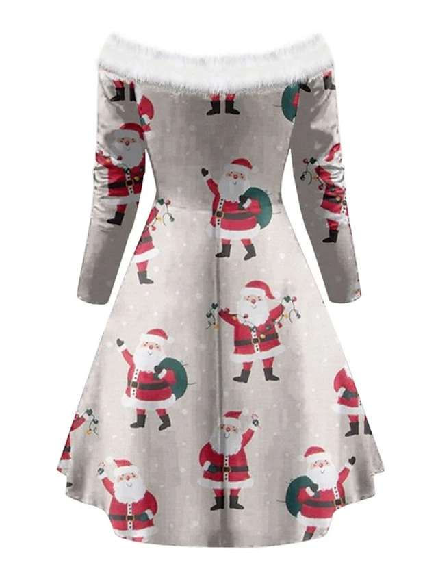 Women’s Christmas Swing Dress Vintage Dress Mini Dress Green Blue Light Green Beige Gray Black Long Sleeve Santa Claus Snowman Snowflake Backless Feather Print Winter Fall Off Shoulder Stylish Elegant