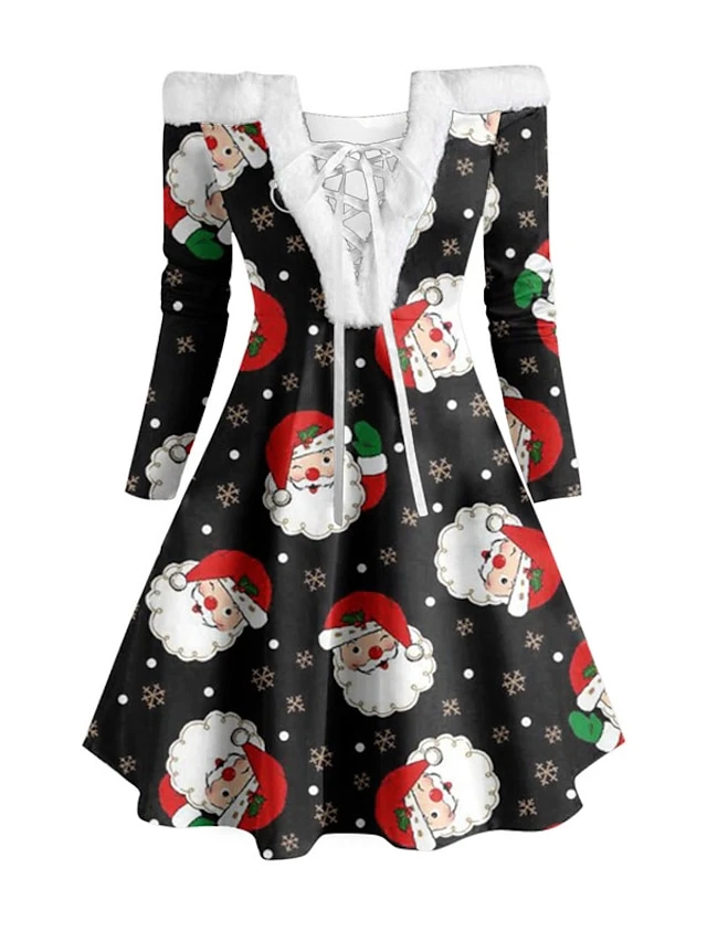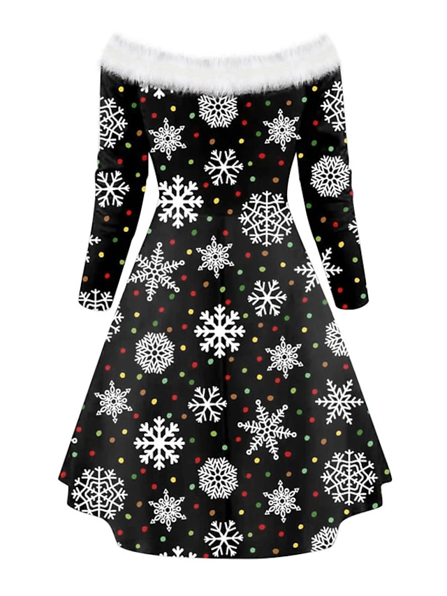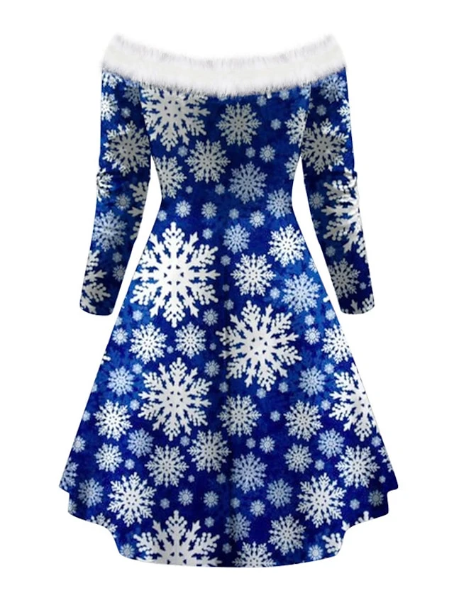 Women’s Christmas Swing Dress Vintage Dress Mini Dress Green Blue Royal Blue Red White Black Long Sleeve Santa Claus Snowman Snowflake Feather Print Winter Fall Off Shoulder Stylish Elegant
