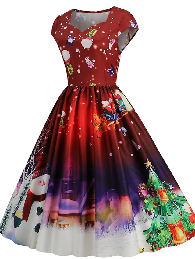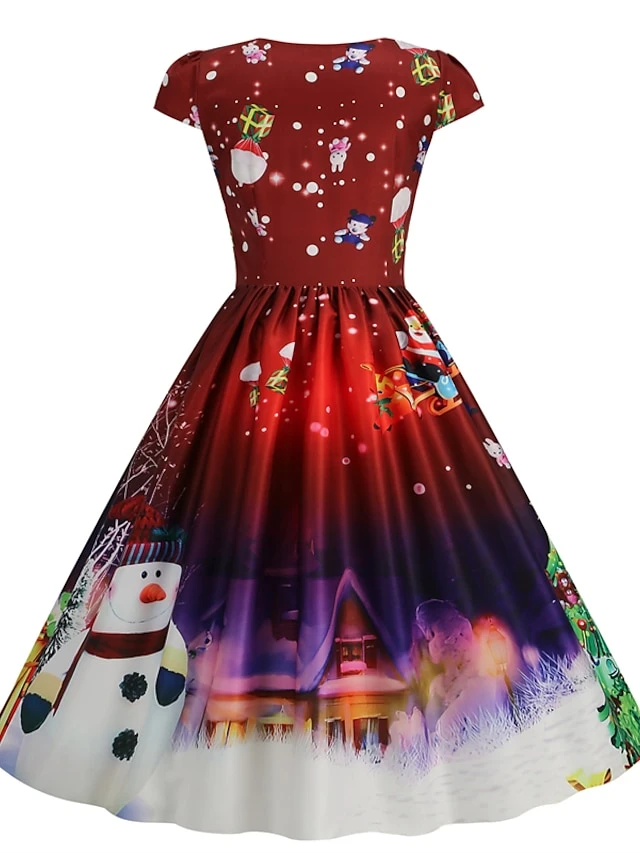 Women’s Christmas Swing Dress Vintage DressKnee Length Dress Blue Wine Red Light BlueShort Sleeve Santa Claus Snowman Tree Print Fall Winter Square Neck Vintage Elegant Slim 2022 S M L XL