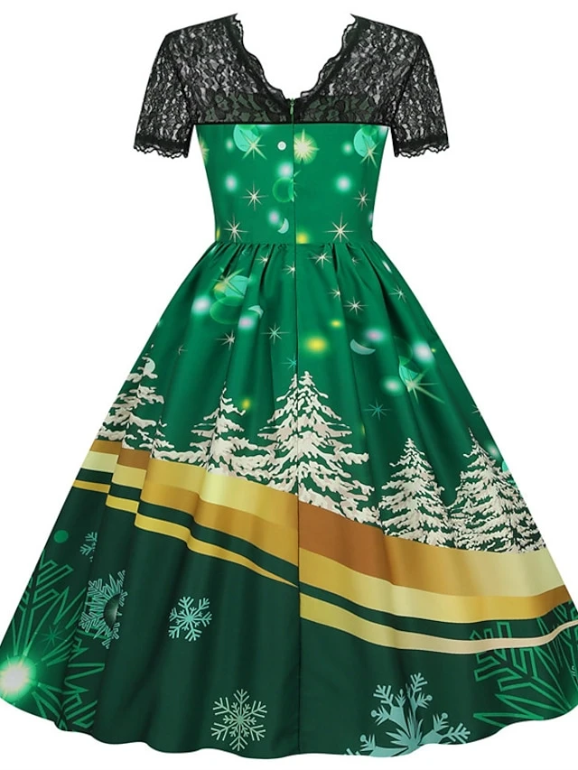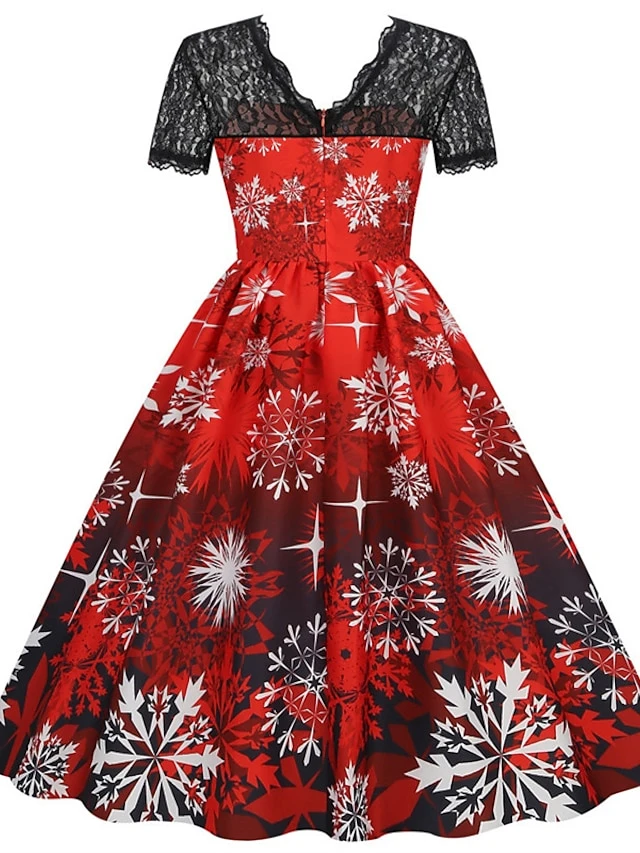 Women’s Christmas Swing Dress Vintage DressKnee Length Dress Green Wine Dark Green Fuchsia Red Black Short Sleeve Santa Claus Snowman Snowflake Lace Print Fall Winter V Neck Vacation Vintage 2022 S