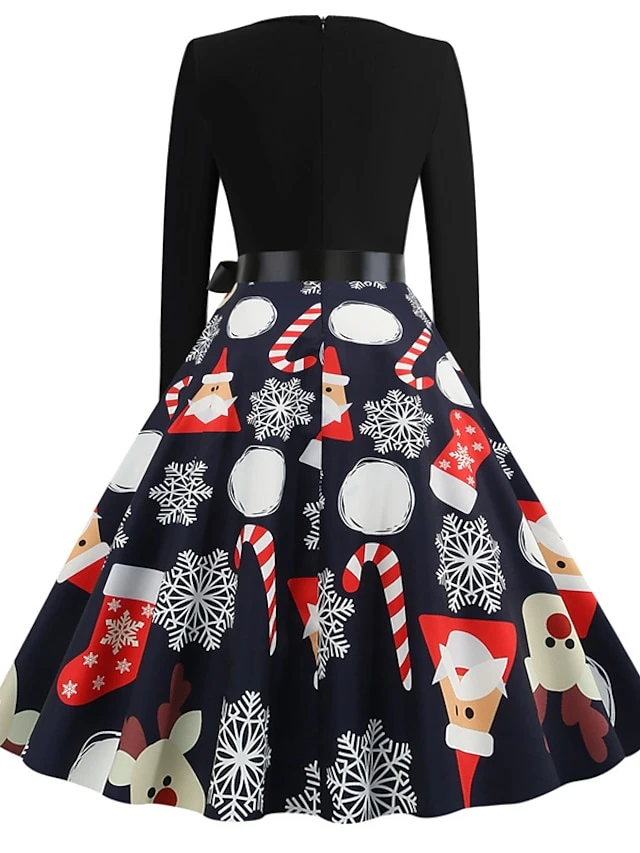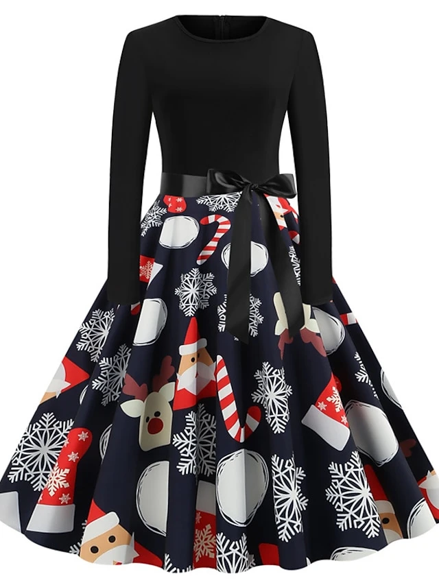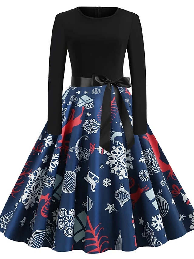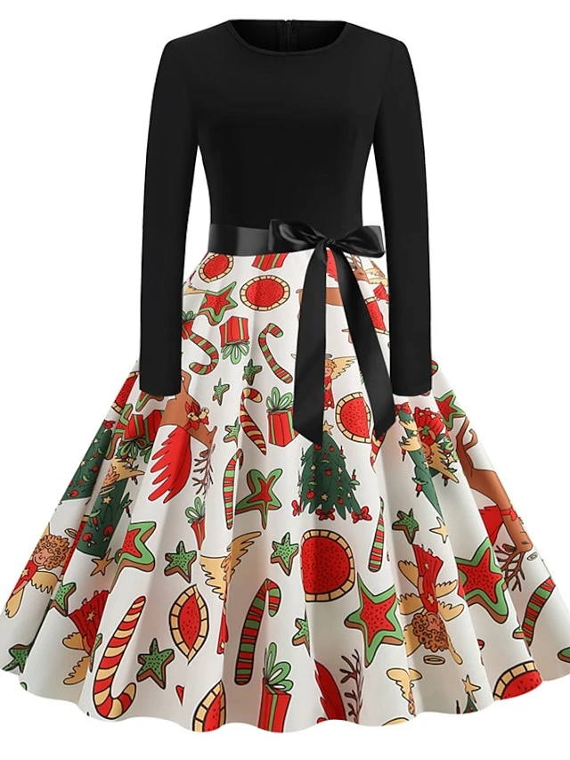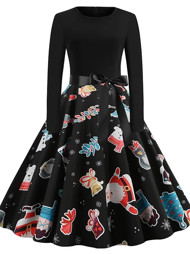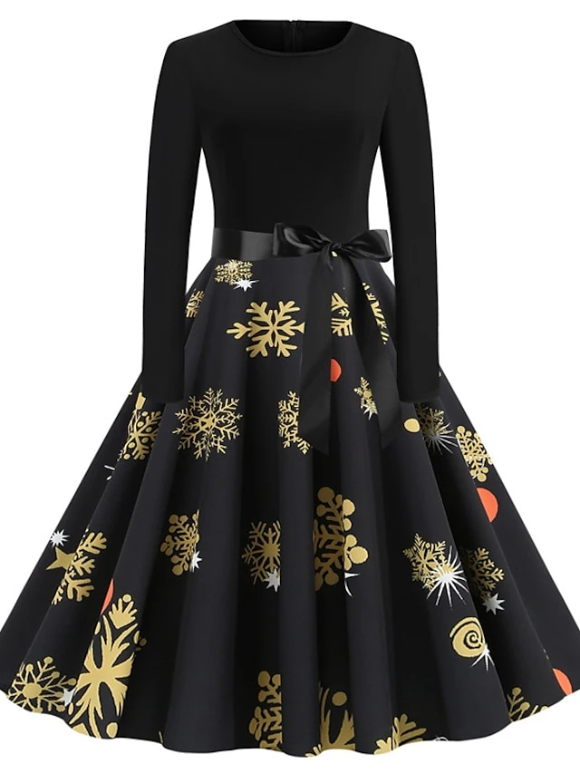 Women’s Christmas Swing DressKnee Length Dress Black And White White Light Red Gold Red Long Sleeve Elk Snowman Bell Bow Print Fall Winter Round Neck Vintage Elegant 2022 S M L XL 2XL