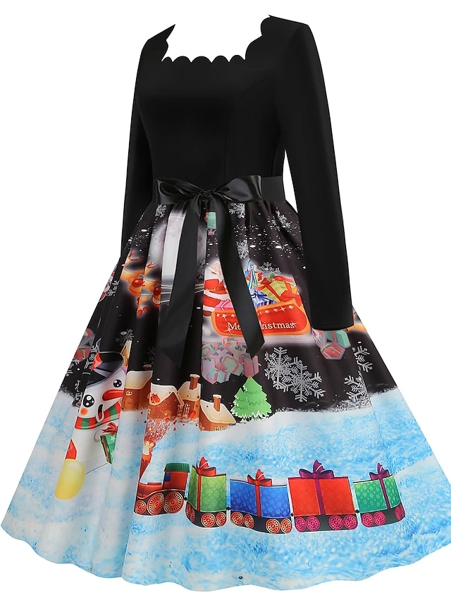 Women’s Christmas Vintage Dress Swing Dress Mini Dress Black Pink Dark Blue Red Navy Blue Light Blue Long Sleeve Santa Claus Elk Snowman With Belt Print Winter Fall Square Neck 2022 S M L XL