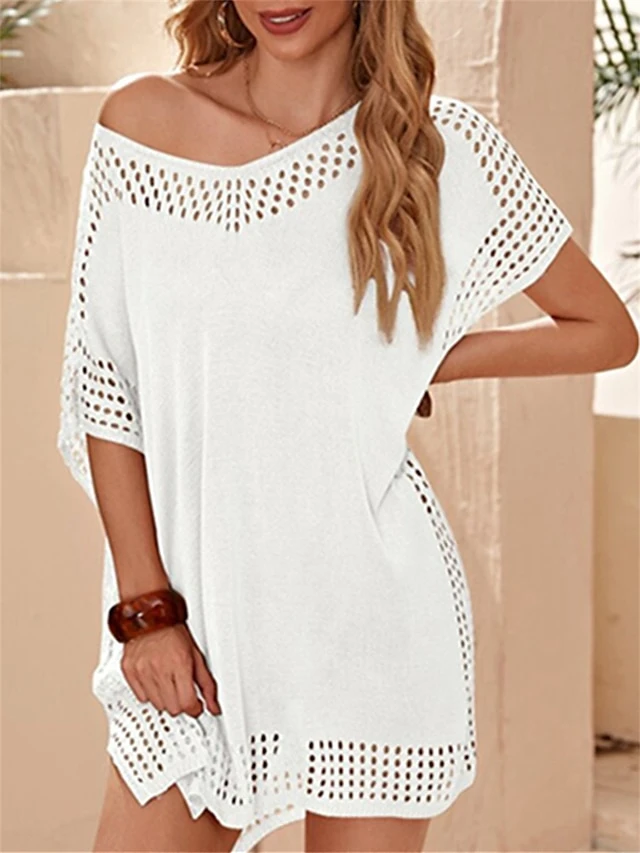 Women’s Cover Up Beach Dress Beach Wear Mini Dress Hollow Out Slim Fashion Modern Solid Color V Neck Half Sleeve Loose Fit Daily Vacation Black White 2023 Summer Spring S L