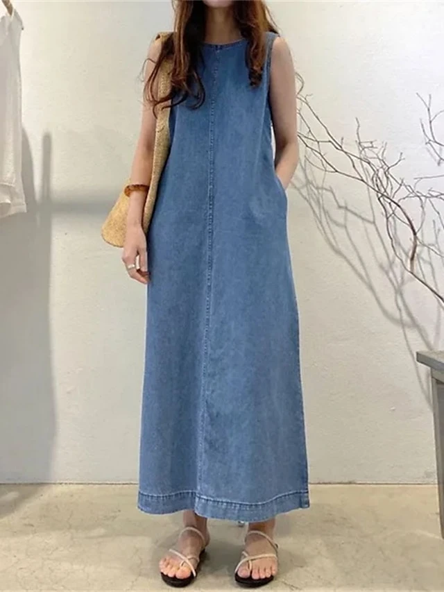 Women’s Denim Dress Shift Dress Maxi Long Dress Denim Modern Casual Vacation Crew Neck Patchwork Sleeveless Summer Spring 2023 Regular Fit Black Royal Blue Blue Pure Color S M L XL 2XL
