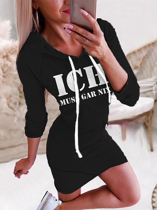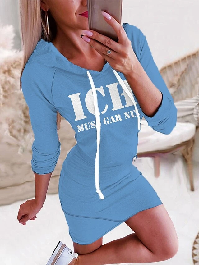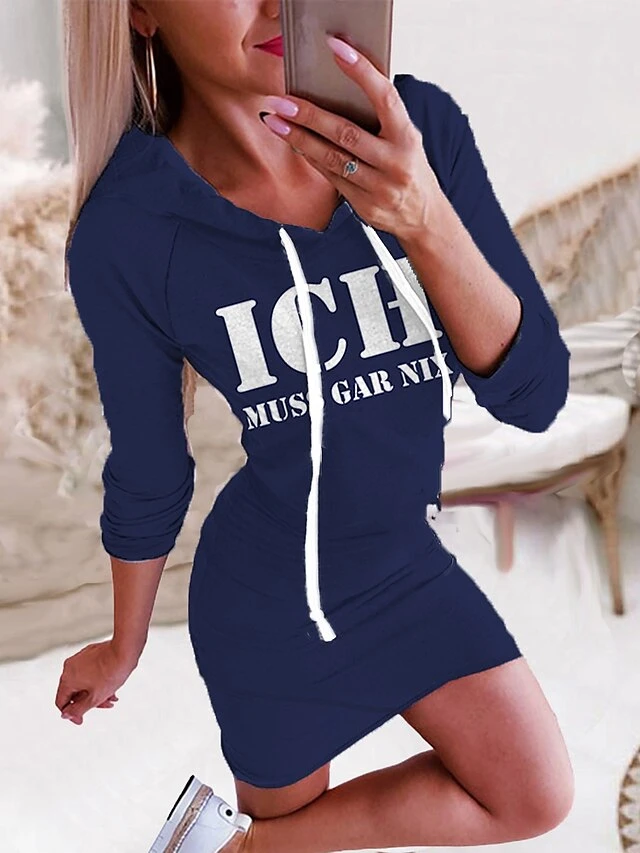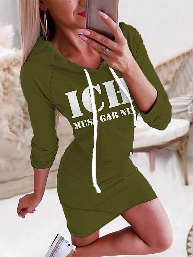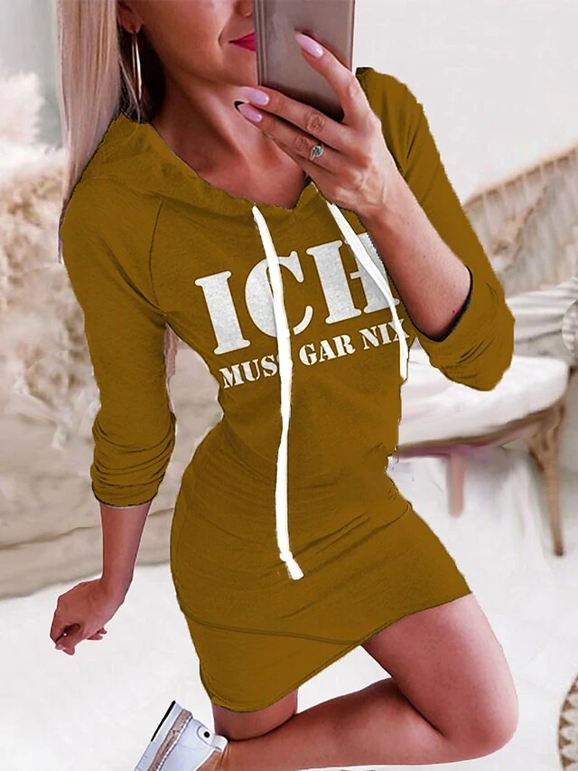 Women‘s Hoodie Dress Winter DressBodycon Short Mini Dress Green Black Yellow Wine Dark Gray Red Navy Blue Light Blue Long Sleeve Fall Letter Print Fall Spring Hooded Fashion 2022 S M L XL XXL 3XL