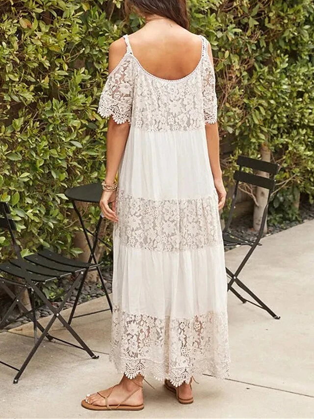 Women’s Long Dress Maxi Dress Casual Dress Lace Dress White Dress Plain Fashion Modern Daily Holiday Vacation Lace Cold Shoulder Short Sleeve Square Neck Dress Regular Fit White Beige Summer Spring S