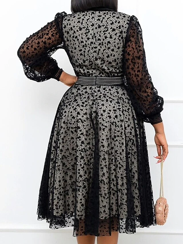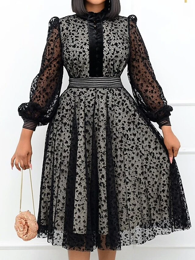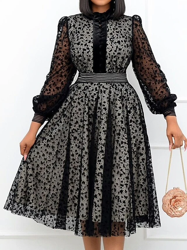 Women‘s Plus Size Curve Black Dress Easter Dress Crew Neck Lace Vacation Dress Solid Color Long Sleeve Fall Winter Prom Dress Midi Dress