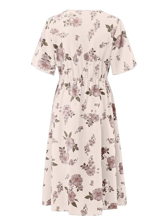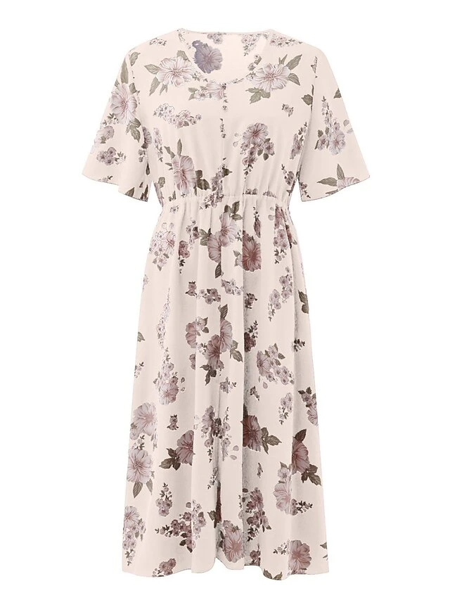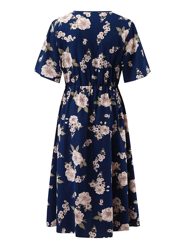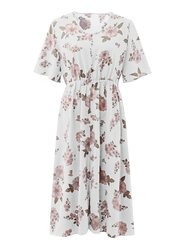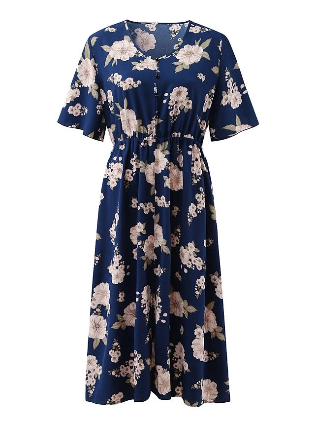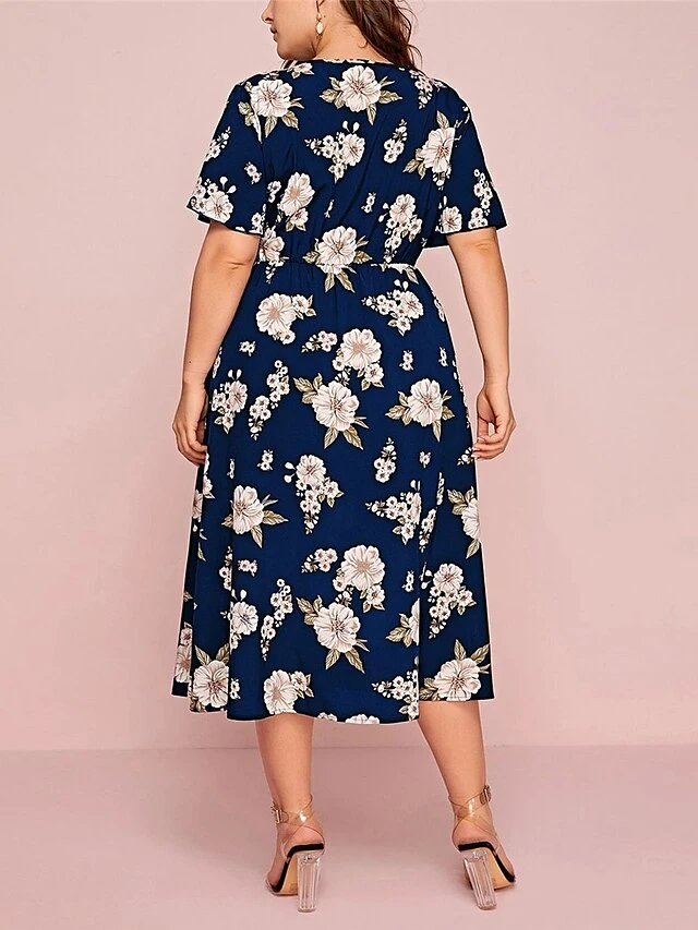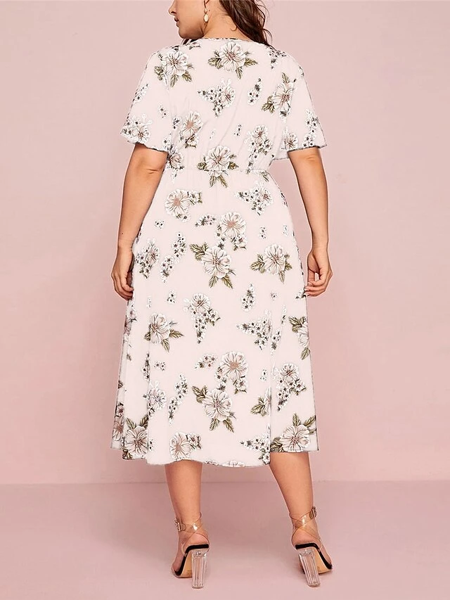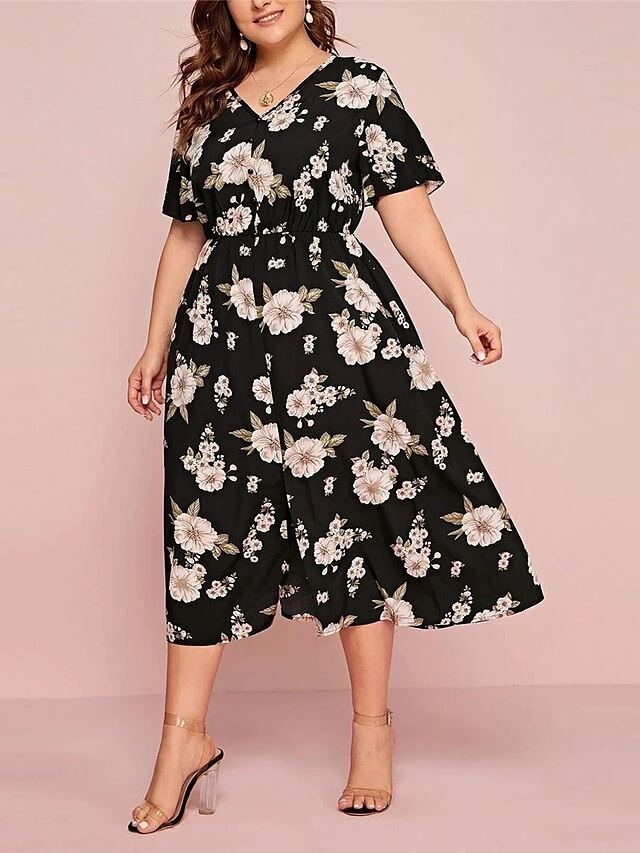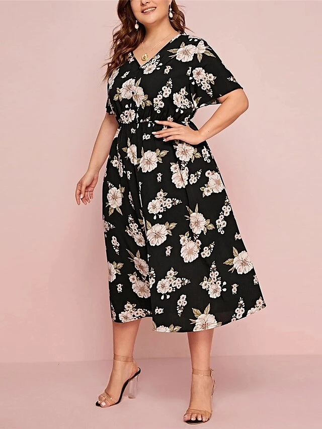 Women‘s Plus Size Curve Casual Dress A Line Dress Floral Dress Floral Midi Dress Short Sleeve Print V Neck Fashion Daily Black White Spring Summer L XL XXL 3XL