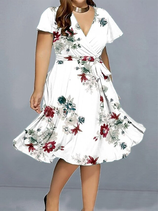Women‘s Plus Size Curve Casual Dress A Line Dress Floral Midi Dress Short Sleeve Print V Neck Elegant Daily Black White Summer Spring L XL XXL 3XL 4XL