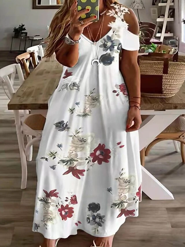 Women‘s Plus Size Curve Casual Dress A Line Dress Graphic Floral Long Dress Maxi Dress Short Sleeve Cut Out Print V Neck Fashion Daily White Red Spring Summer L XL XXL 3XL