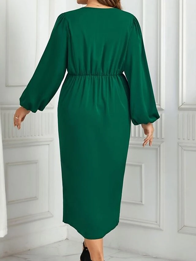 Women’s Plus Size Curve Casual Dress A Line Dress Plain Midi Dress Long Sleeve Ruched V Neck Fashion Outdoor Green Fall Winter XL XXL 3XL 4XL