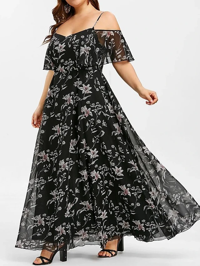 Women‘s Plus Size Curve Casual Dress Chiffon Dress Swing Dress Floral Long Dress Maxi Dress Short Sleeve Backless Print Strap Fashion Daily Black Summer Spring L XL XXL 3XL 4XL