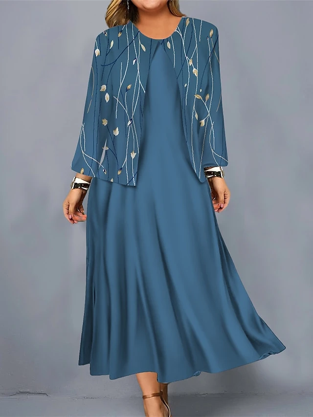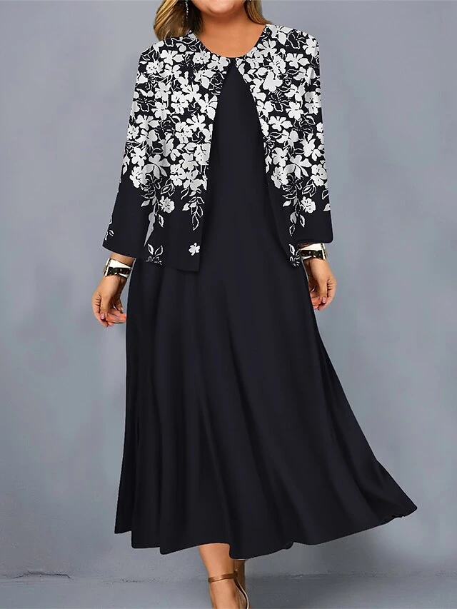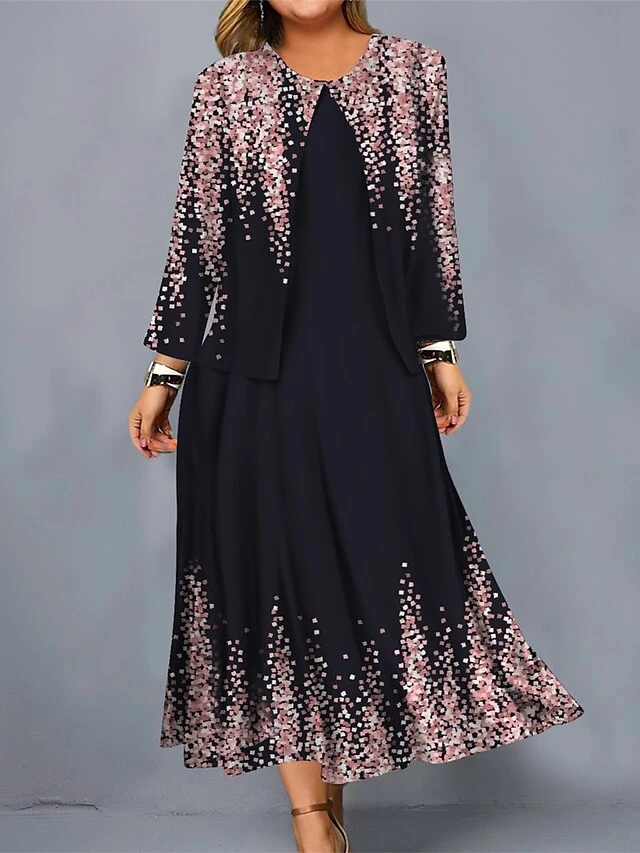 Women’s Plus Size Curve Casual Dress Dress Set Two Piece Dress Floral Gradient Midi Dress Long Sleeve Print Crew Neck Mature Outdoor Black Pink Fall Winter L XL XXL 3XL 4XL