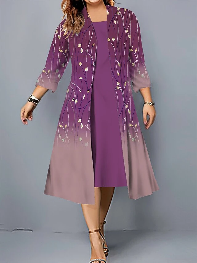 Women’s Plus Size Curve Casual Dress Dress Set Two Piece Dress Floral Midi Dress 3/4 Length Sleeve Print Crew Neck Fashion Outdoor Navy Blue Fuchsia Fall Winter L XL XXL 3XL 4XL