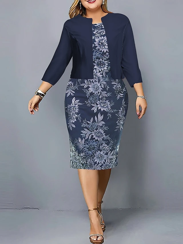 Women’s Plus Size Curve Casual Dress Dress Set Two Piece Dress Floral Midi Dress Long Sleeve Print Crew Neck Fashion Outdoor Black Blue Fall Winter L XL XXL 3XL 4XL