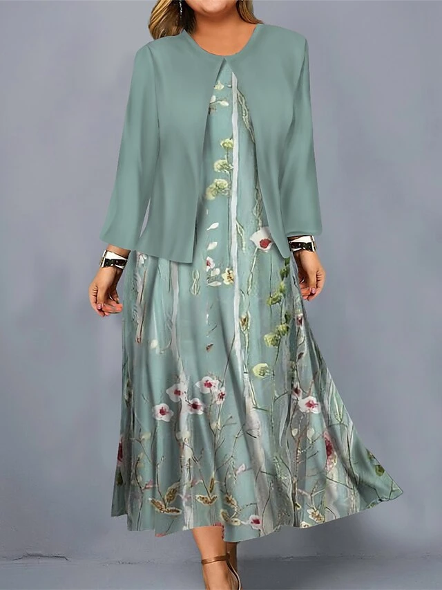 Women’s Plus Size Curve Casual Dress Dress Set Two Piece Dress Floral Midi Dress Long Sleeve Print Crew Neck Fashion Outdoor Deep Purple Purple Fall Winter L XL XXL 3XL 4XL