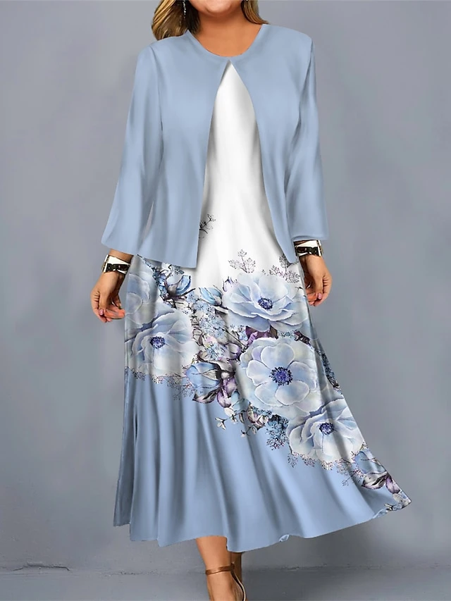 Women’s Plus Size Curve Casual Dress Dress Set Two Piece Dress Floral Midi Dress Long Sleeve Print Crew Neck Mature Outdoor Pink Light Blue Fall Winter L XL XXL 3XL 4XL