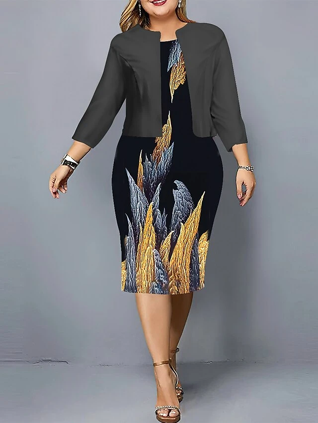 Women’s Plus Size Curve Casual Dress Dress Set Two Piece Dress Leaf Floral Midi Dress Long Sleeve Print Crew Neck Fashion Outdoor Black Wine Fall Winter L XL XXL 3XL 4XL