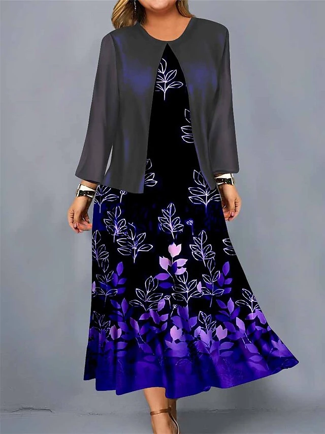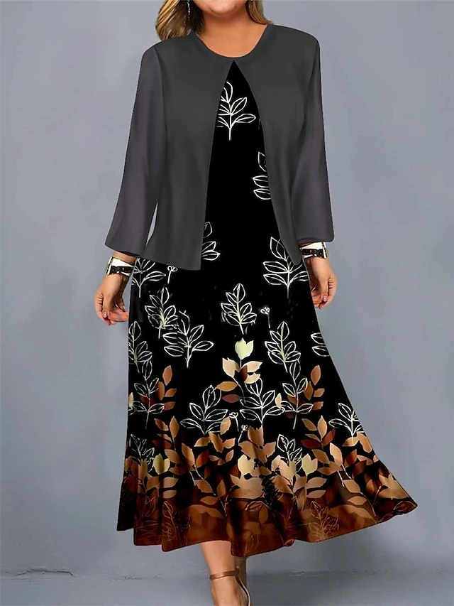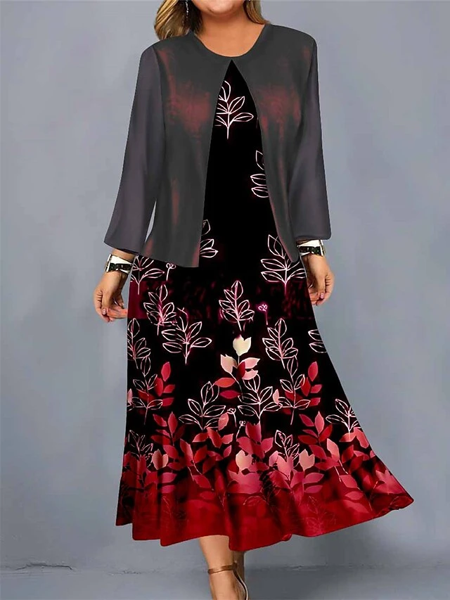 Women’s Plus Size Curve Casual Dress Dress Set Two Piece Dress Leaf Gradient Midi Dress Long Sleeve Print Crew Neck Mature Outdoor Yellow Red Fall Winter L XL XXL 3XL 4XL