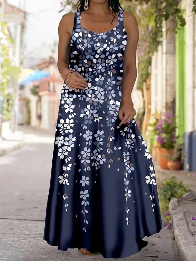 Women‘s Plus Size Curve Casual Dress Strap Dress Floral Coconut Tree Long Dress Maxi Dress Sleeveless Print Strap Fashion Outdoor Navy Blue Blue Summer Spring L XL XXL 3XL 4XL