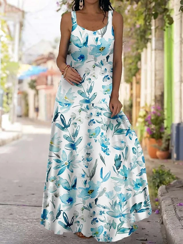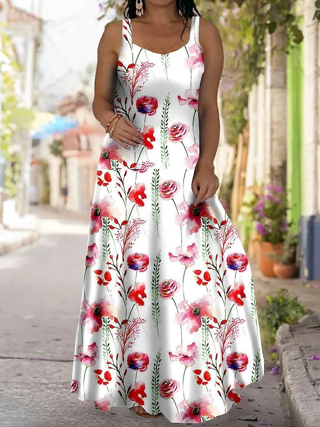 Women‘s Plus Size Curve Casual Dress Strap Dress Floral Long Dress Maxi Dress Sleeveless Print Strap Fashion Outdoor White Yellow Summer Spring L XL XXL 3XL 4XL