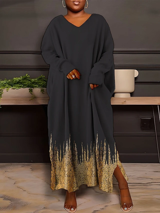Women’s Plus Size Curve Casual Dress Sweatshirt Dress Winter Dress Floral Gradient Long Dress Maxi Dress Long Sleeve Split Print V Neck Fashion Outdoor Black White Fall Winter L XL XXL 3XL 4XL