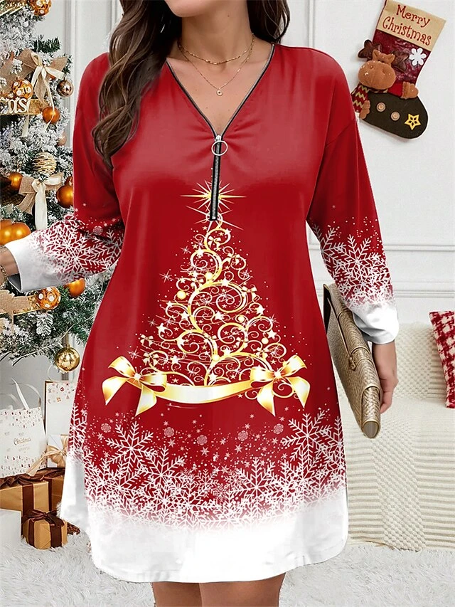 Women’s Plus Size Curve Christmas Dress Casual Dress Winter Dress Christmas Tree Snowflake Mini Dress Long Sleeve Print V Neck Fashion Outdoor Black Wine Fall Winter L XL 2XL 3XL 4XL