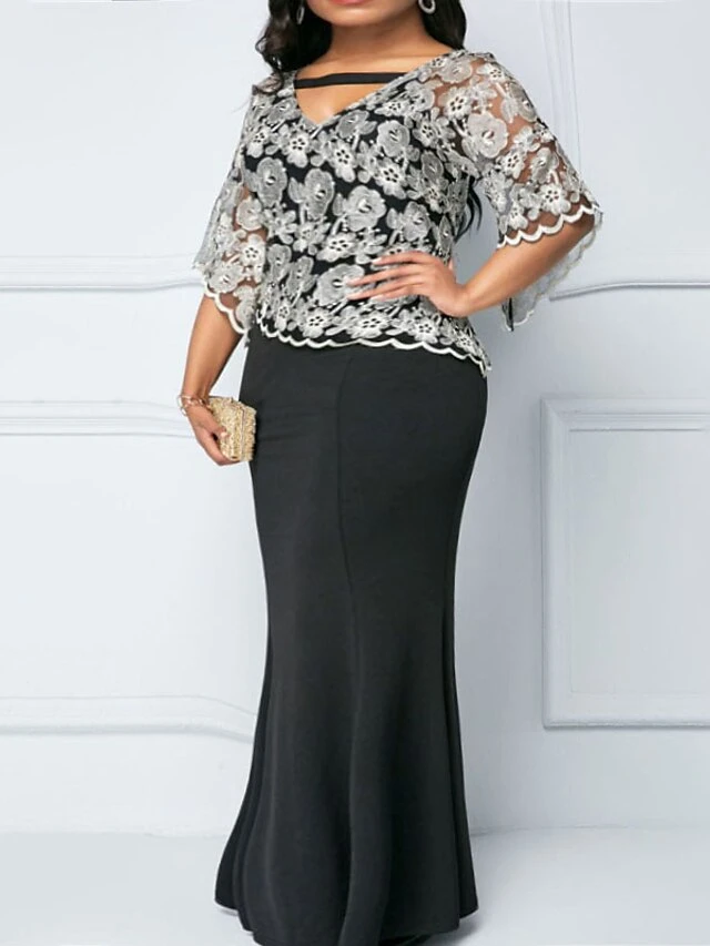 Women‘s Plus Size Curve Easter Dress Party Dress Solid Color V Neck Lace Half Sleeve Fall Spring Dress Elegant Prom Dress Maxi Dress Formal Dress
