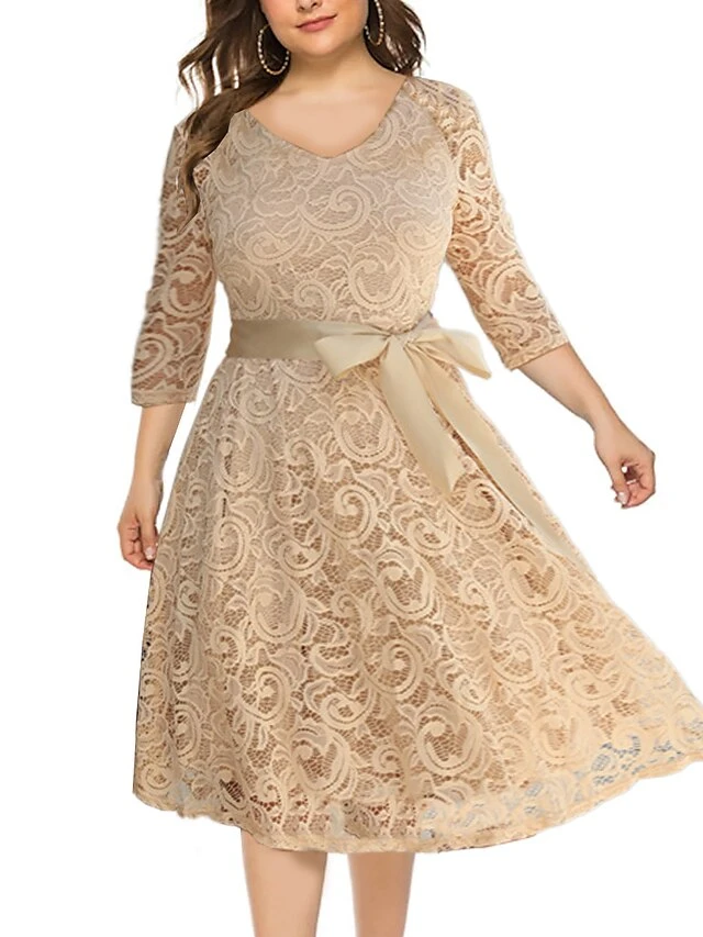 Women‘s Plus Size Curve Flattering Dresses Elegant Apple Shaped Dress Wedding Guest Lace Dress Work Dress A Line Dress Solid Color Midi Dress Sleeve Lace V Neck Fashion Office Khaki Spring Summer