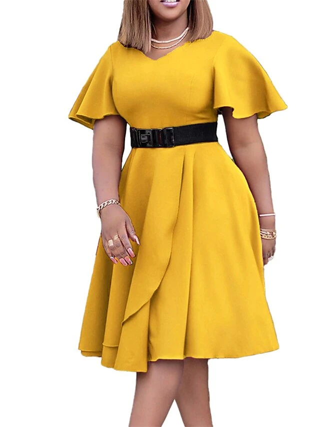 Women‘s Plus Size Curve Flattering Dresses Elegant Apple Shaped Dress Wedding Guest Work Dress Pure Color V Neck Ruffle Short Sleeve Spring Fall Work Knee Length Dress Going Out Work Dress