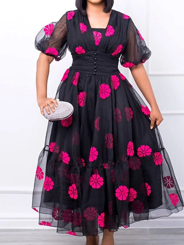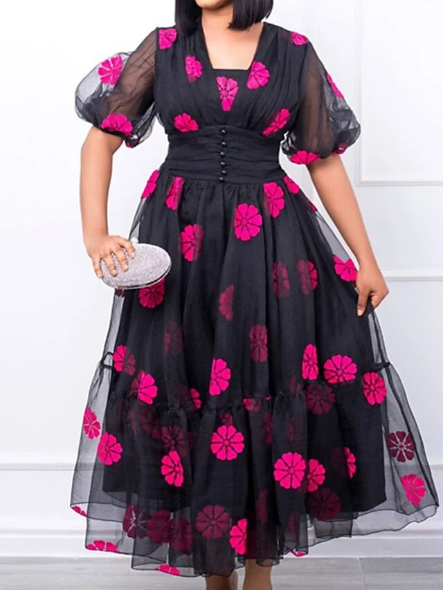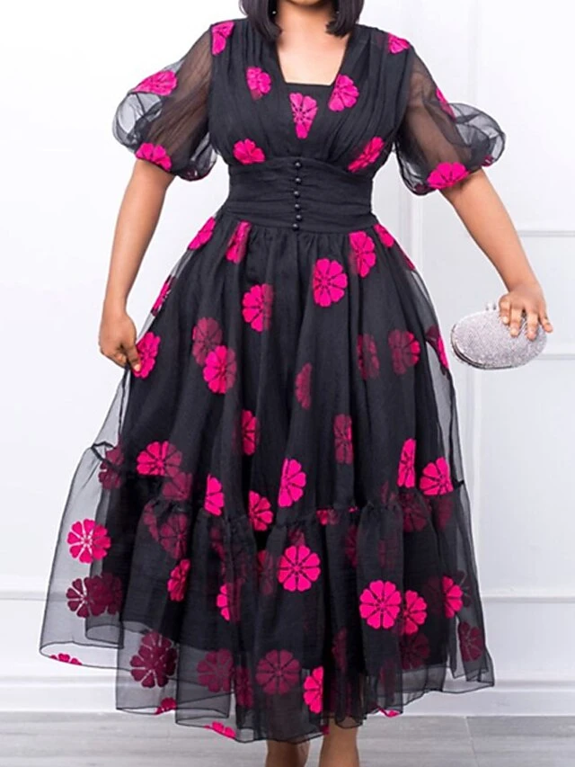 Women‘s Plus Size Curve Holiday Dress Floral V Neck Mesh Puff Sleeve Short Sleeve Fall Spring Prom Dress Maxi Long Dress Holiday Date Dress Print