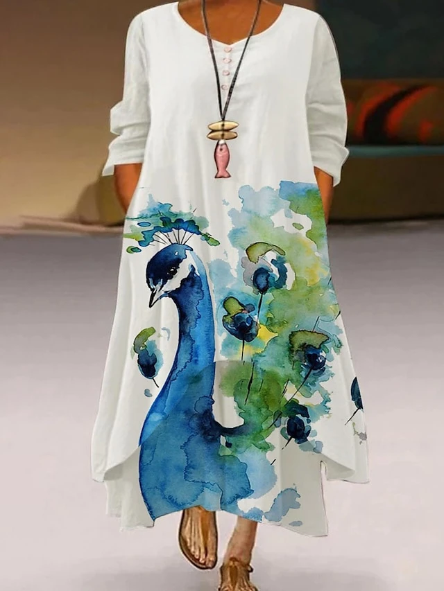 Women‘s Plus Size Curve Holiday Dress Print Crew Neck Long Sleeve Fall Winter Casual Vintage Maxi Long Dress Daily Dress