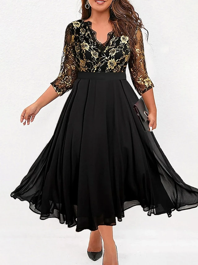 Women’s Plus Size Curve Party Dress Chiffon Dress Swing Dress Floral Long Dress Maxi Dress 3/4 Length Sleeve Mesh Patchwork V Neck Fashion Party Black Fall Winter L XL XXL 3XL 4XL