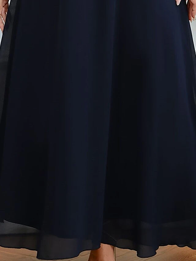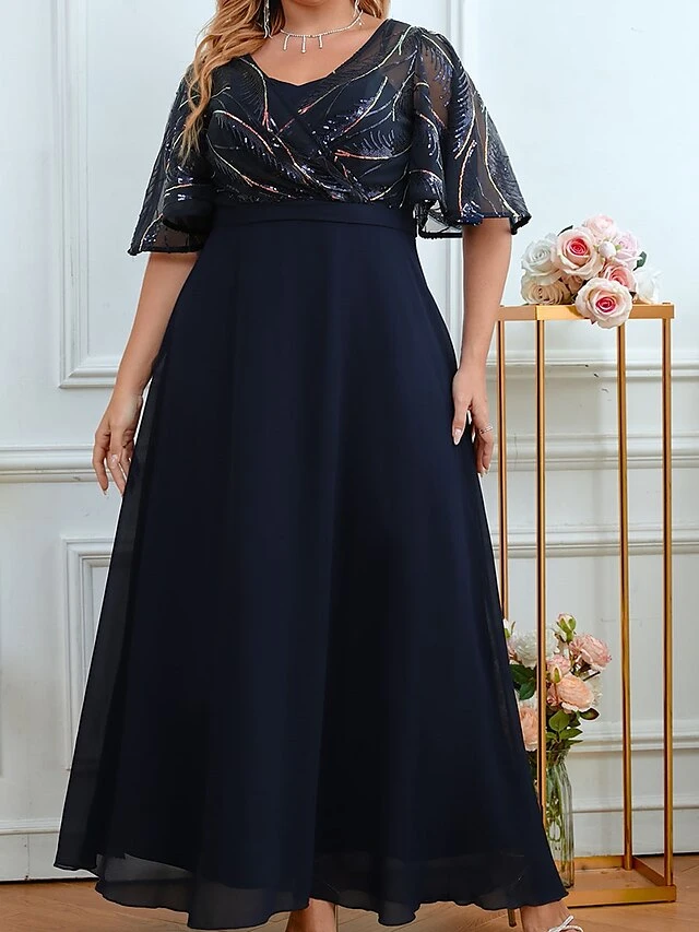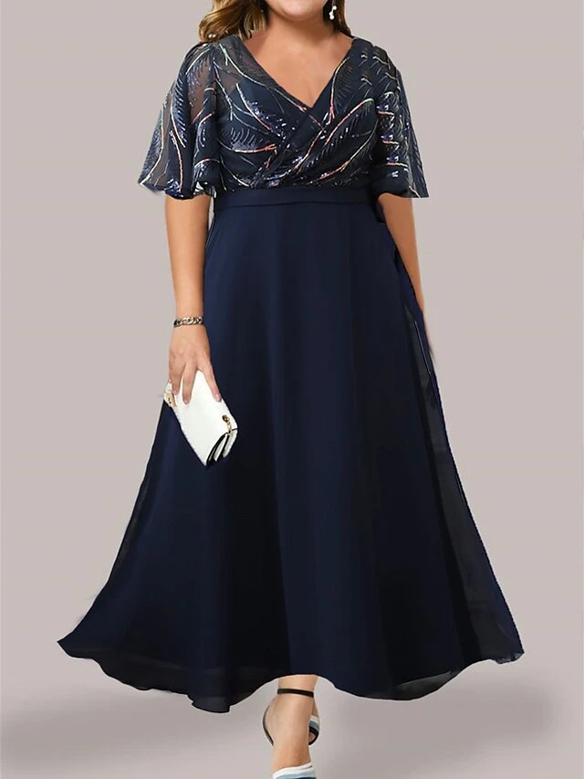 Women‘s Plus Size Curve Party Dress Chiffon Dress Swing Dress Leaf Long Dress Maxi Dress Half Sleeve Mesh Print V Neck Fashion Party Navy Blue Summer Spring L XL XXL 3XL 4XL