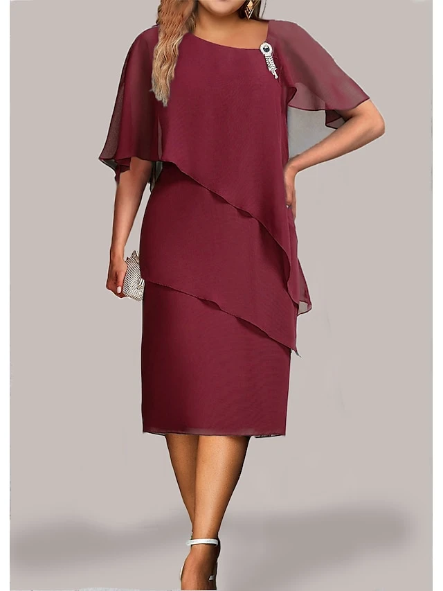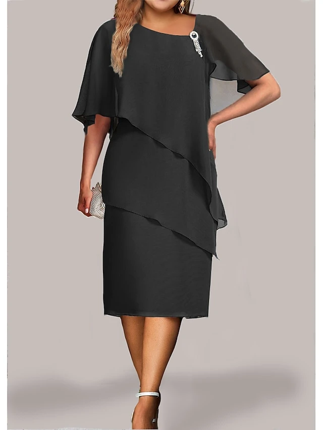Women’s Plus Size Curve Party Dress Cocktail Dress Chiffon Dress Plain Midi Dress Half Sleeve Ruffle Layered V Neck Fashion Party Blue Fall Winter L XL XXL 3XL 4XL