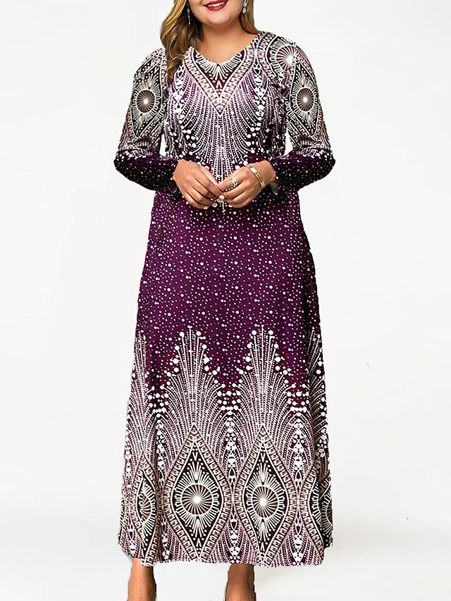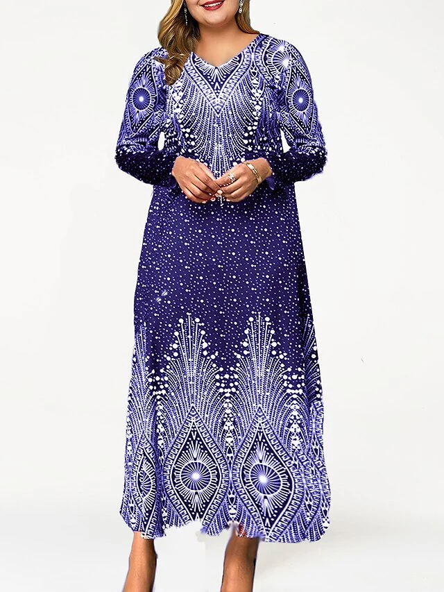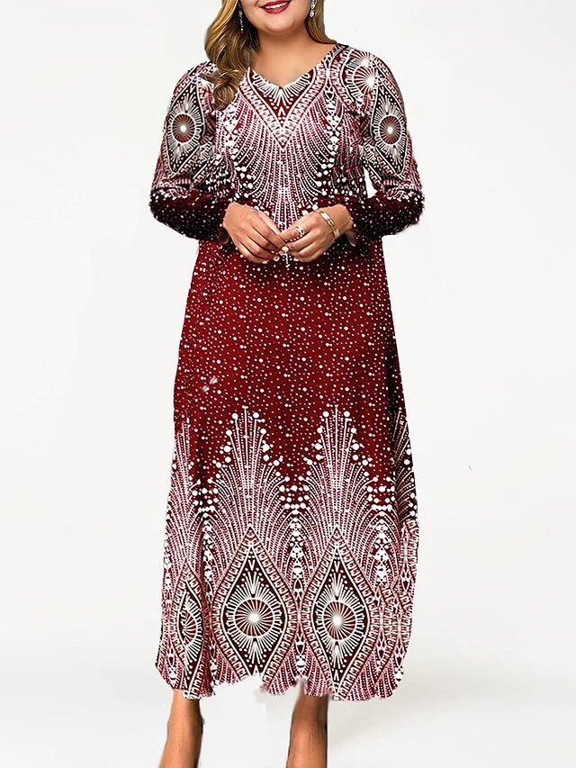 Women’s Plus Size Curve Party Dress Cocktail Dress Sheath Dress Geometric Long Dress Maxi Dress Long Sleeve Print V Neck Fashion Party Red Blue Fall Winter L XL XXL 3XL 4XL