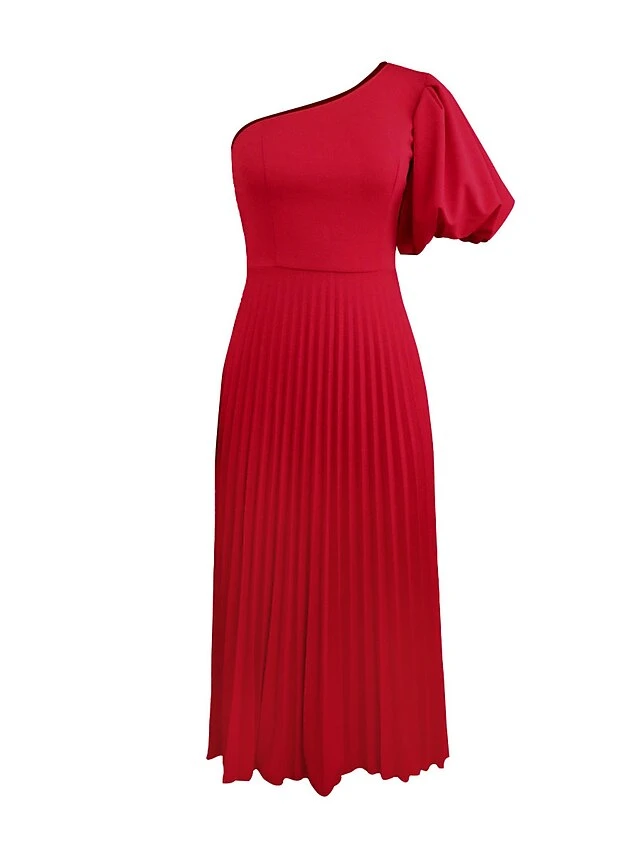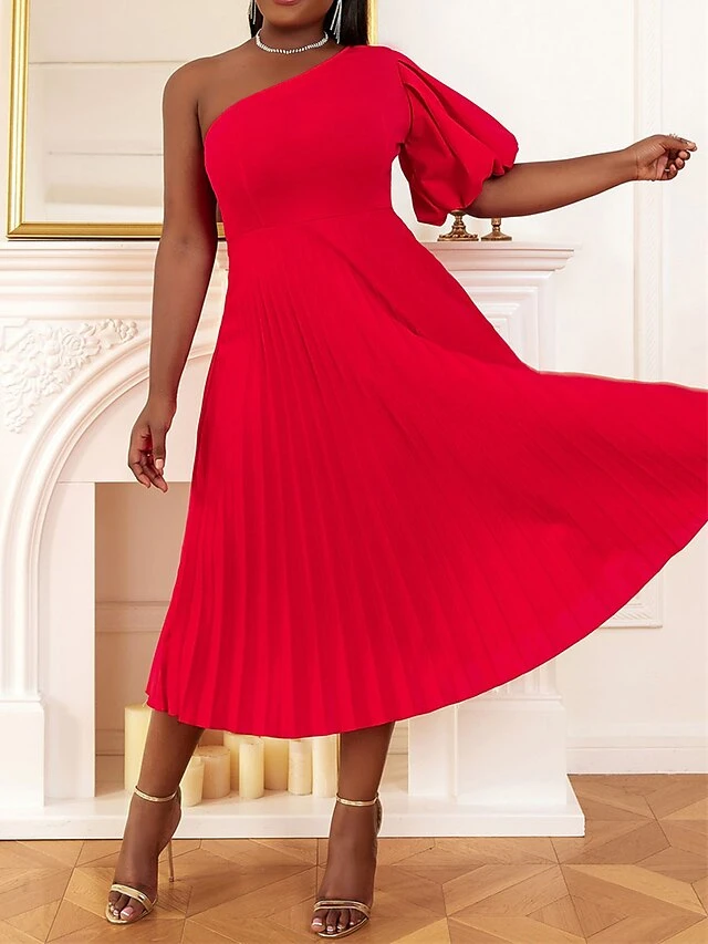 Women’s Plus Size Curve Party Dress Cocktail Dress Swing Dress Plain Midi Dress Half Sleeve Pleated One Shoulder Fashion Party Red Fall Winter XL XXL 3XL 4XL