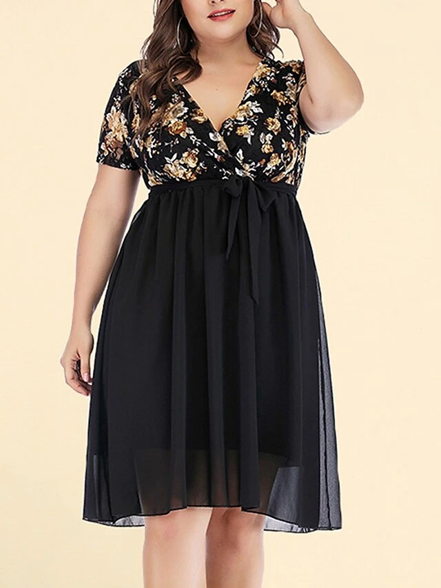 Women‘s Plus Size Curve Party Dress Cocktail Dress Wedding Guest Dress Midi Dress Black Wine Short Sleeve Floral Lace Up Summer Spring Fall V Neck Fashion Birthday Wedding Guest Vacation 2023
