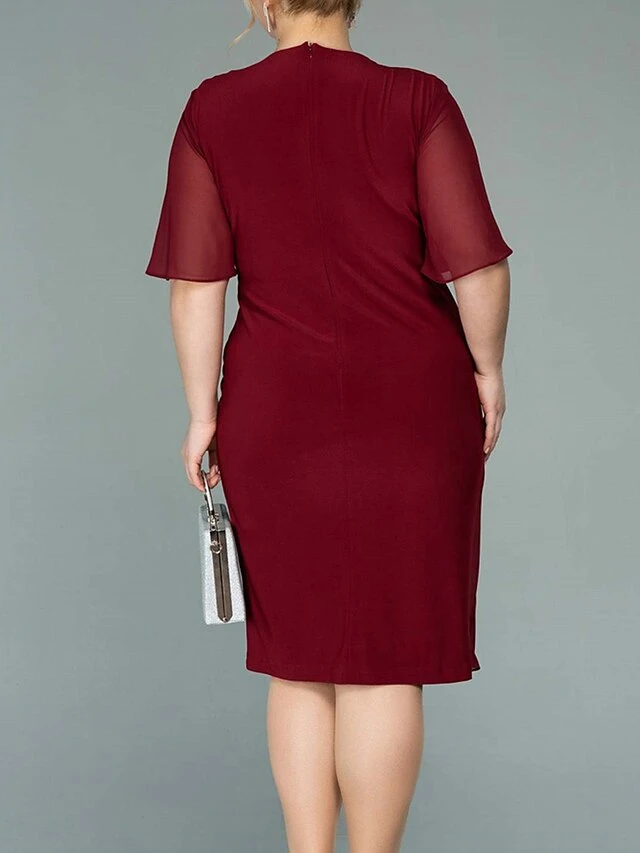 Women‘s Plus Size Curve Party Dress Cocktail Dress Wedding Guest Dress Midi Dress Wine Half Sleeve Pure Color Beads Summer Spring Fall V Neck Fashion Birthday Wedding Guest Vacation 2023