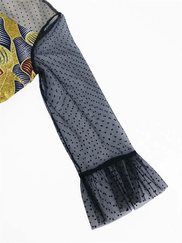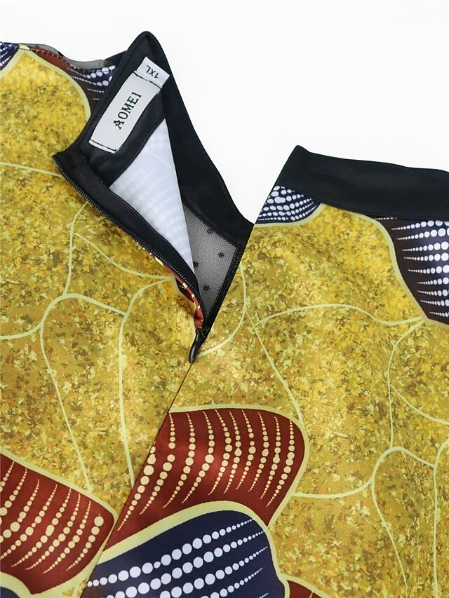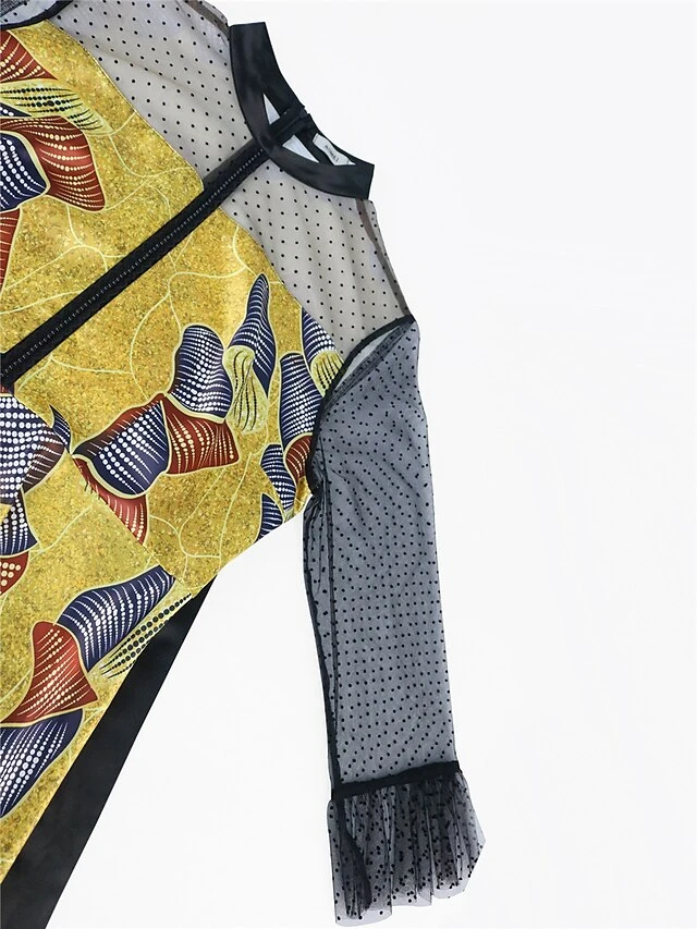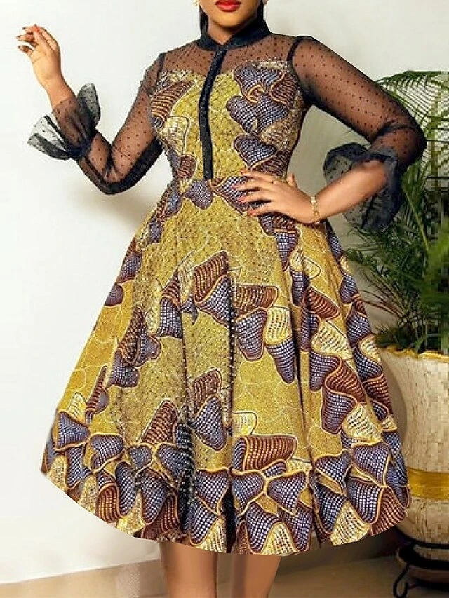 Women‘s Plus Size Curve Party Dress Cocktail Dress Wedding Guest Dress Midi Dress Yellow Long Sleeve Color Block Mesh Summer Spring Fall Stand Collar Fashion Wedding Guest Vacation Fall Dress 2023