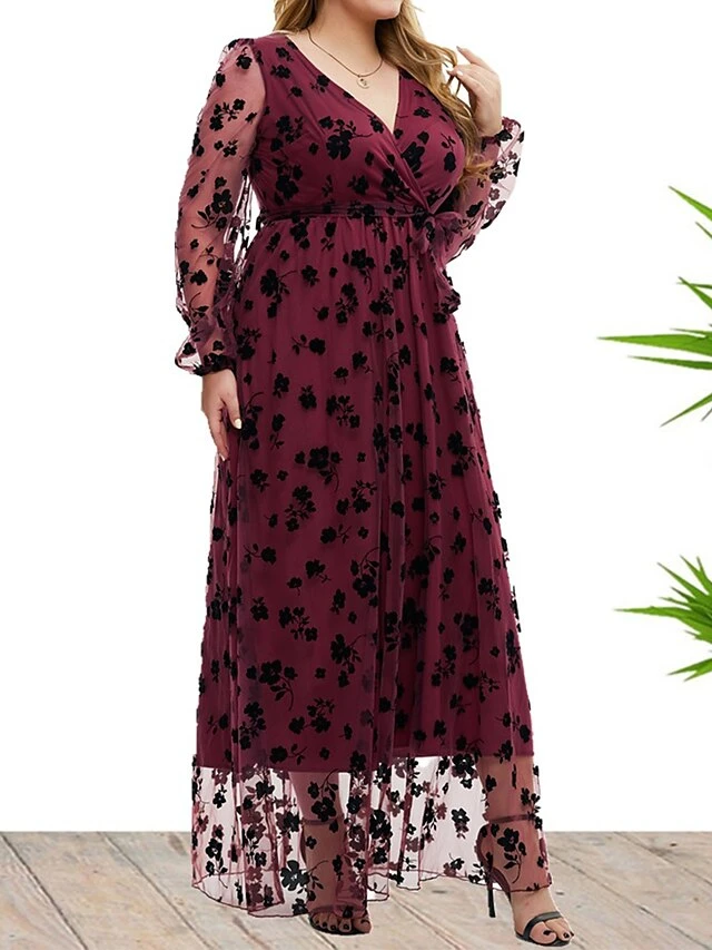 Women’s Plus Size Curve Party Dress Formal Dress Burgundy Dress Floral Long Dress Maxi Dress Long Sleeve Lace Up Ruched V Neck Fashion Wedding Wine Spring Fall XL XXL 3XL 4XL 5XL