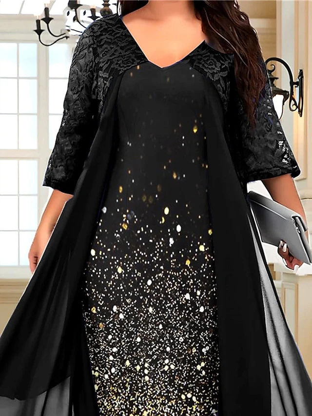 Women’s Plus Size Curve Party Dress Lace Dress Cocktail Dress Gradient Midi Dress 3/4 Length Sleeve Lace Patchwork V Neck Fashion Party Gold Fall Winter L XL XXL 3XL 4XL