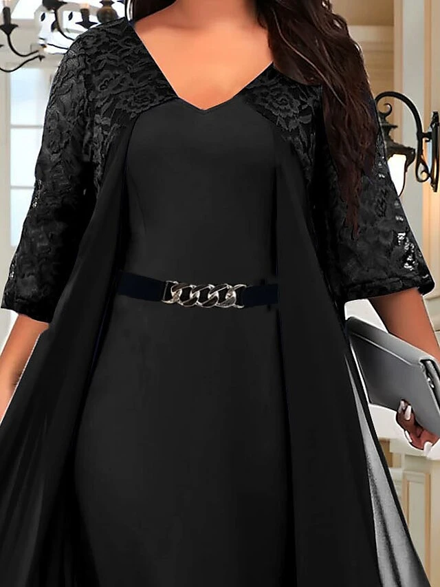 Women’s Plus Size Curve Party Dress Lace Dress Cocktail Dress Plain Midi Dress 3/4 Length Sleeve Lace Patchwork V Neck Fashion Party Black Fall Winter L XL XXL 3XL 4XL