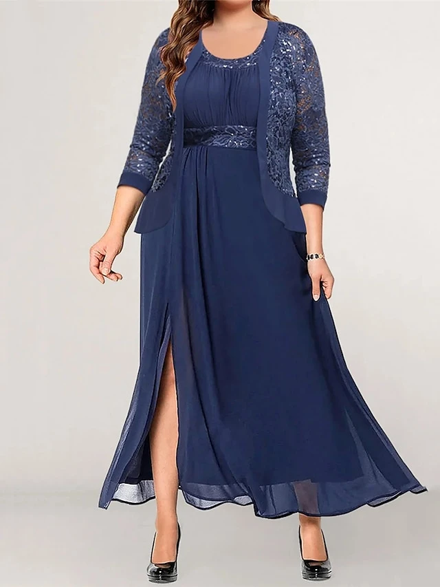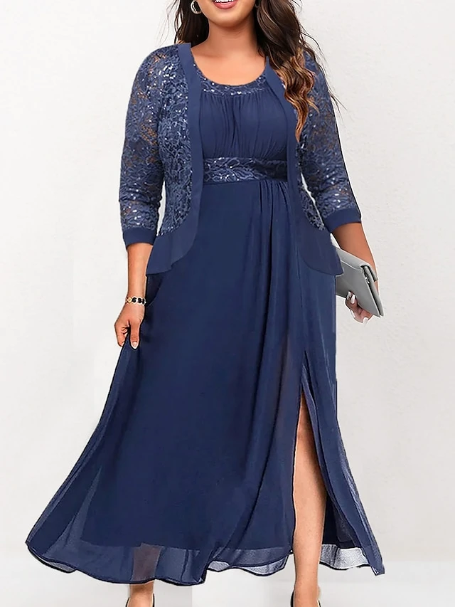 Women’s Plus Size Curve Party Dress Lace Dress Dress Set Plain Long Dress Maxi Dress 3/4 Length Sleeve Lace Patchwork Crew Neck Fashion Party Navy Blue Fall Winter L XL XXL 3XL 4XL