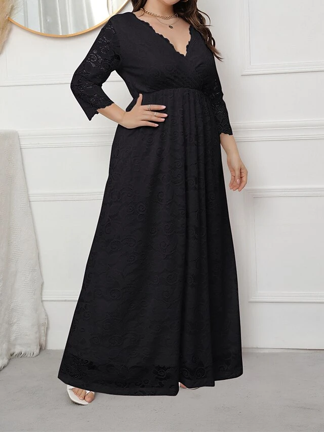Women’s Plus Size Curve Party Dress Lace Dress Formal Dress Solid Color Long Dress Maxi Dress 3/4 Length Sleeve Lace V Neck Fashion Wedding Black White Spring Fall XL XXL 3XL 4XL 5XL