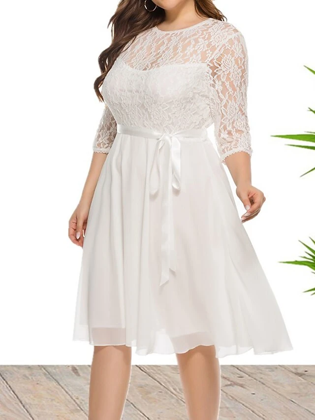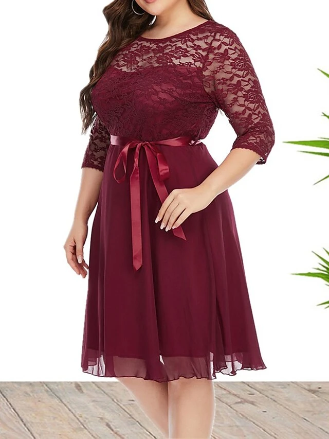 Women’s Plus Size Curve Party Dress Lace Dress Sheath Dress Solid Color Midi Dress 3/4 Length Sleeve Lace Up Lace Crew Neck Fashion Wedding White Wine Spring Fall XL XXL 3XL 4XL 5XL