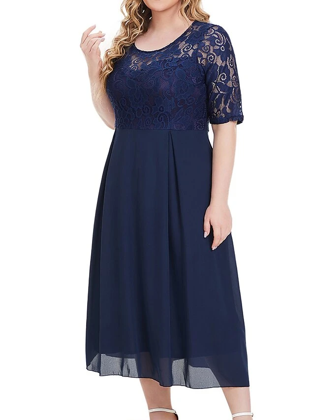 Women’s Plus Size Curve Party Dress Lace Dress Sheath Dress Solid Color Midi Dress Short Sleeve Lace Patchwork Crew Neck Fashion Wedding Dark Blue Spring Fall XL XXL 3XL 4XL 5XL